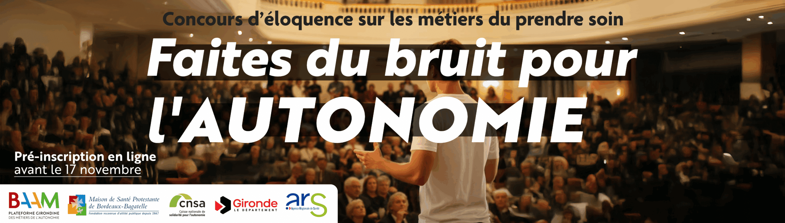 Organisé par la Plateforme girondine des métiers de l’autonomie – BAAM*, en partenariat avec la Caisse nationale de solidarité pour l’autonomie (CNSA), le Département de la Gironde, l’Agence Régionale de Santé et France Travail, le concours d’éloquence « Faites du bruit pour l’autonomie » invite chacun à valoriser les métiers de l’aide, de l’accompagnement et du soin.
